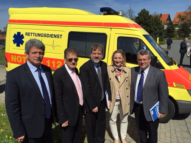 Η επίσκεψη πραγματοποιήθηκε στο πλαίσιο της Ελληνο-Γερμανικής Συνέλευσης για την παράδοση ενός ασθενοφόρου, Mercedes 313 CDI με αναπνευστήρα και μηχάνημα αναρρόφησης, το οποίο αποτελεί δωρεά της υπηρεσίας διάσωσης της Περιφέρειας του Harz, στην Ελληνική Αντιπροσωπεία για τις ανθρωπιστικές υπηρεσίες του Γενικού Νοσοκομείου Δράμας. Η παράδοση του ασθενοφόρου στην Ελληνική Αντιπροσωπεία έγινε παρουσία του έπαρχου κ. Martin Skiebe.