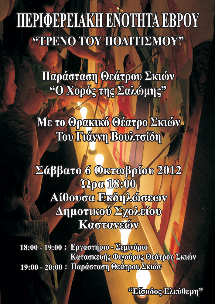 Η δράση θα πραγματοποιηθεί στην Αίθουσα Εκδηλώσεων του Δημοτικού Σχολείου Καστανεών το Σάββατο 6 Οκτωβρίου 2012 και ώρα 6μ.μ. και θα περιλαμβάνει την παράσταση «Ο χορός της Σαλώμης», δραματοποίηση μύθων του Αισώπου και εργαστήριο κατασκευής φιγούρας Θεάτρου Σκιών.