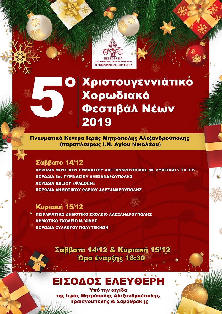 Παραδοσιακά κάλαντα και κλασικά τραγούδια των Χριστουγέννων και της Πρωτοχρονιάς θα χαρίσουν οι χορωδίες που συμμετέχουν στο «5ο Χριστουγεννιάτικο Χορωδιακό Φεστιβάλ Νέων» το Σάββατο 14 και την Κυριακή 15 Δεκεμβρίου 2019, στις 18:30, σε όσους βρεθούν στο Πνευματικό Κέντρο της Ιεράς Μητρόπολης Αλεξανδρούπολης (παραπλεύρως Ιερού Ναού Αγίου Νικολάου).