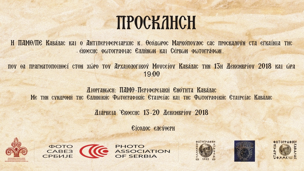 Σας ενημερώνουμε ότι την Πέμπτη 13 Δεκεμβρίου 2018 και ώρα 19:00 θα πραγματοποιηθούν τα εγκαίνια της διακρατικής έκθεσης φωτογραφίας Ελλάδας - Σερβίας στον χώρο του Αρχαιολογικού Μουσείου Καβάλας. Η έκθεση φωτογραφίας αποτελεί συνδιοργάνωση της Περιφερειακής Ενότητας Καβάλας με την Ελληνική Φωτογραφική Εταιρεία και την Φωτογραφική Εταιρεία Καβάλας και θα διαρκέσει από τις 13 έως τις 20 Δεκεμβρίου 2018.