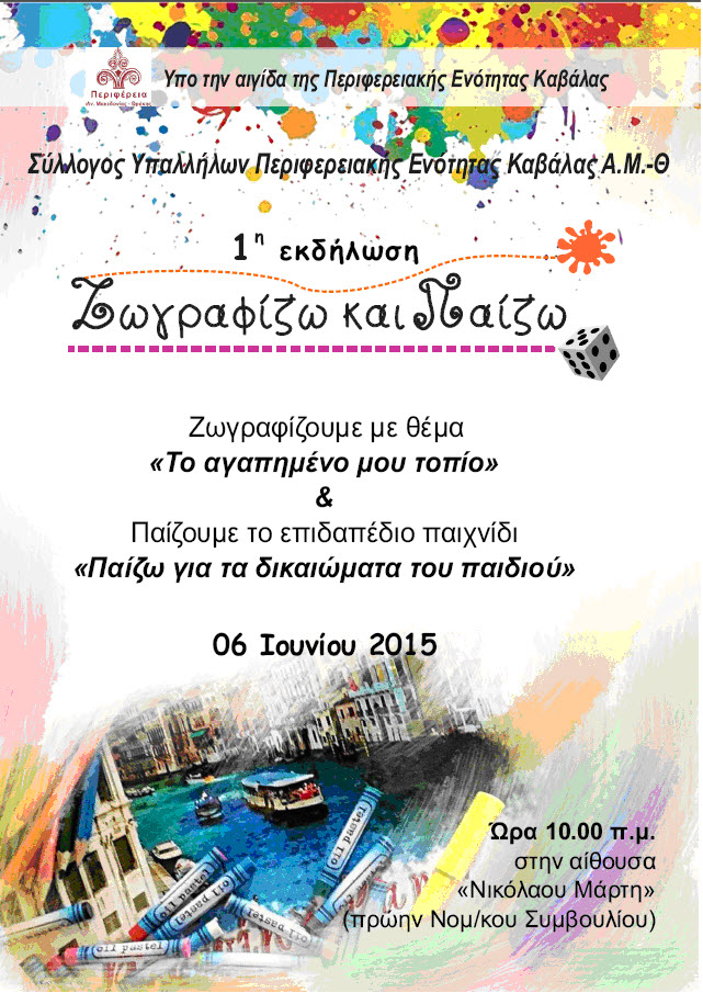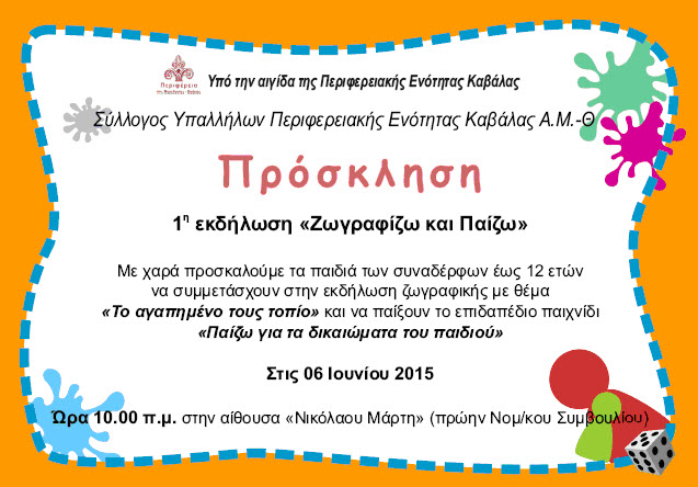 Με χαρά προσκαλούμε τα παιδιά των συναδέλφων έως 12 ετών να συμμετάσχουν στην εκδήλωση Ζωγραφικής με θέμα «Το αγαπημένο τους τοπίο» και να παίξουν το επιδαπέδιο παιχνίδι «Παίζω για τα δικαιώματα του παιδιού» στις 06 Ιουνίου 2015 ,ώρα 10.00 π.μ. στην αίθουσα «Νικολάου Μάρτη».