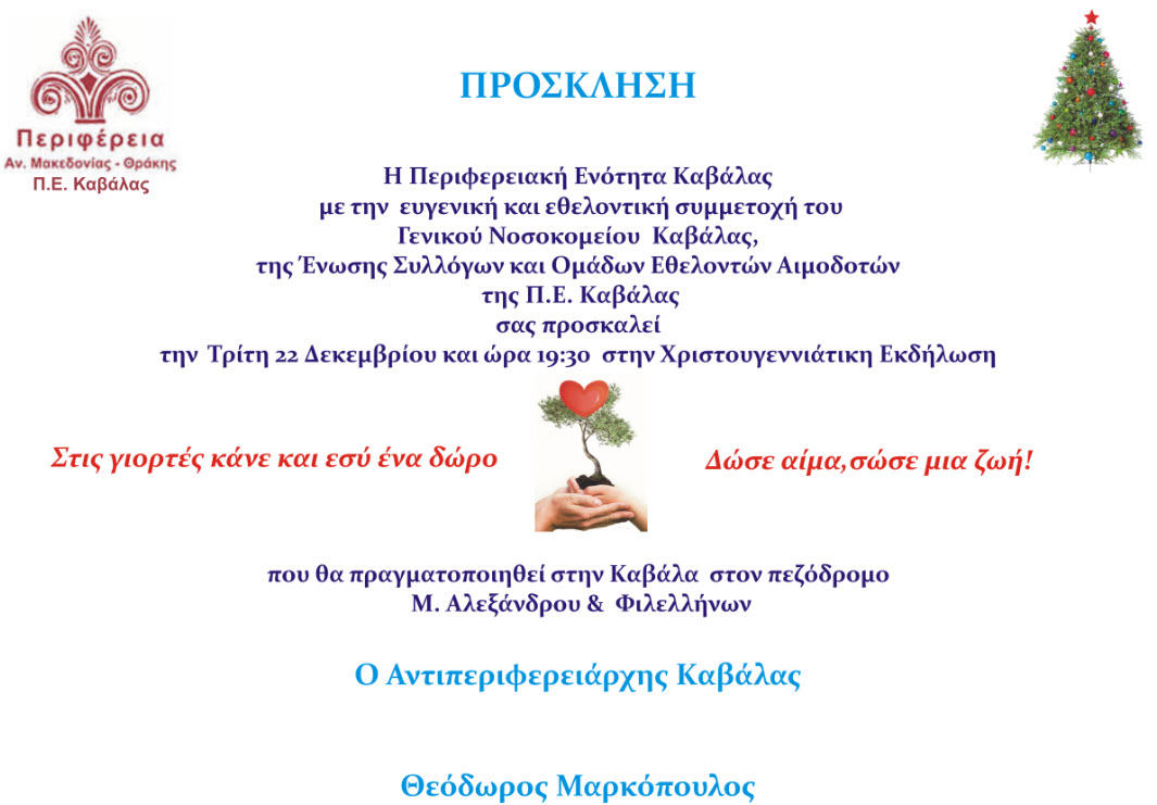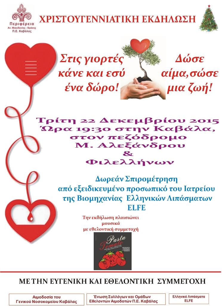 Η ΠΑΜΘ/ΠΕ Καβάλας με την εθελοντική συμμετοχή του Γενικού Νοσοκομείου Καβάλας, της Ένωσης Συλλόγων και ομάδων Εθελοντών Αιμοδοτών της ΠΕ Καβάλας, θα πραγματοποιήσει την Τρίτη 22 Δεκεμβρίου επί της οδού Μεγάλου Αλεξάνδρου & Φιλελλήνων στις 19:30, Χριστουγεννιάτικη εκδήλωση με θέμα «Στις γιορτές κάνε και εσύ ένα δώρο: δώσε αίμα – σώσε μια ζωή».