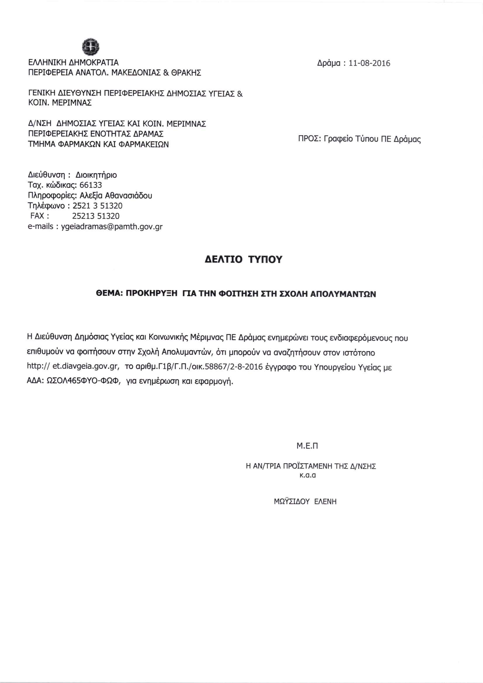 Δ/νσης Δημ. Υγείας & Κοιν. Μέριμνας ΠΕ Δράμας